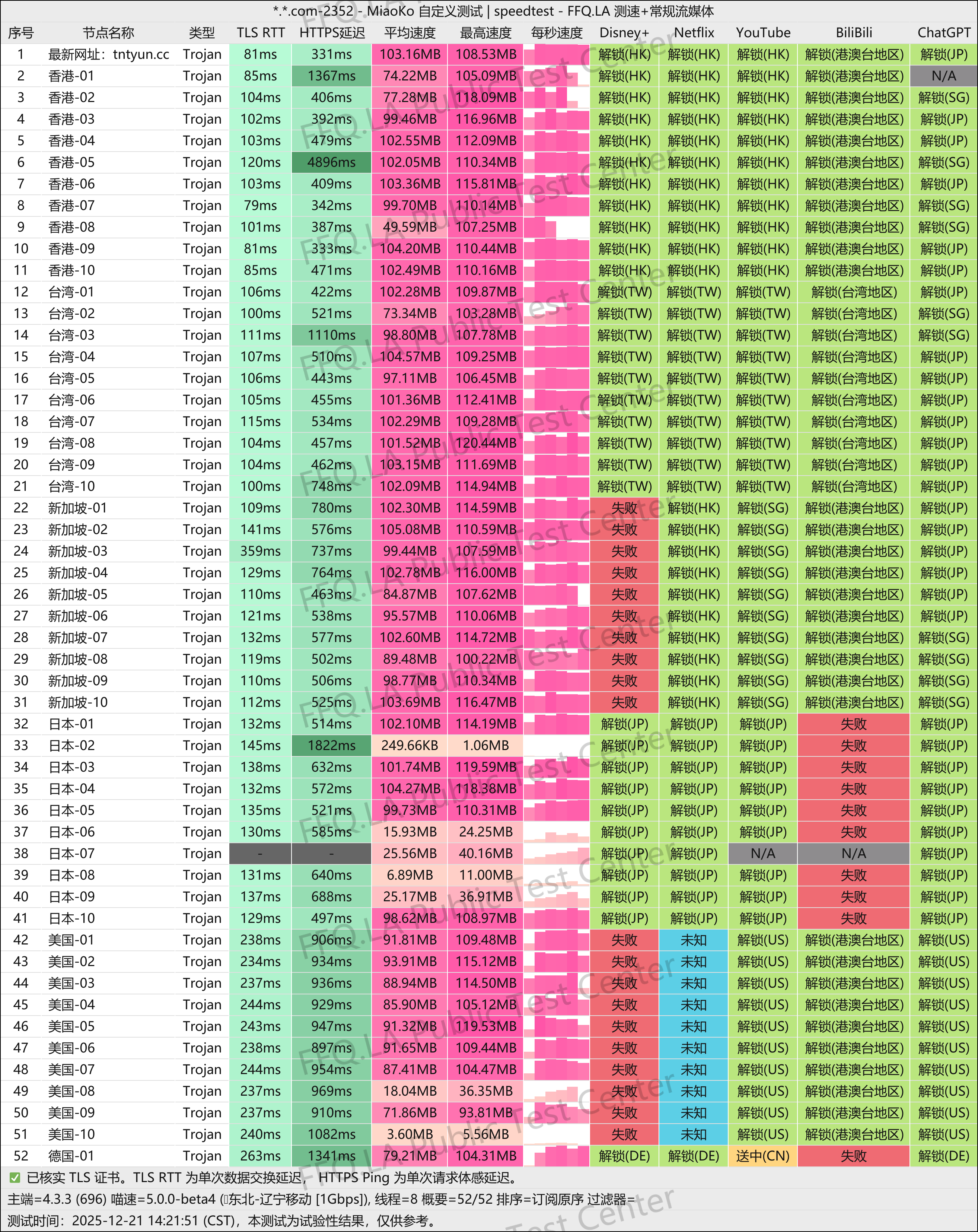 三网优化做的很好,速度快,延迟低,稳定性高,个别地区迪士尼和bilibili解锁不行,影响不大,可以切别的节点观看。这个数据和价格相符,不存在信息差。本周测速数据还行,解锁也很绿,稳定不错的。