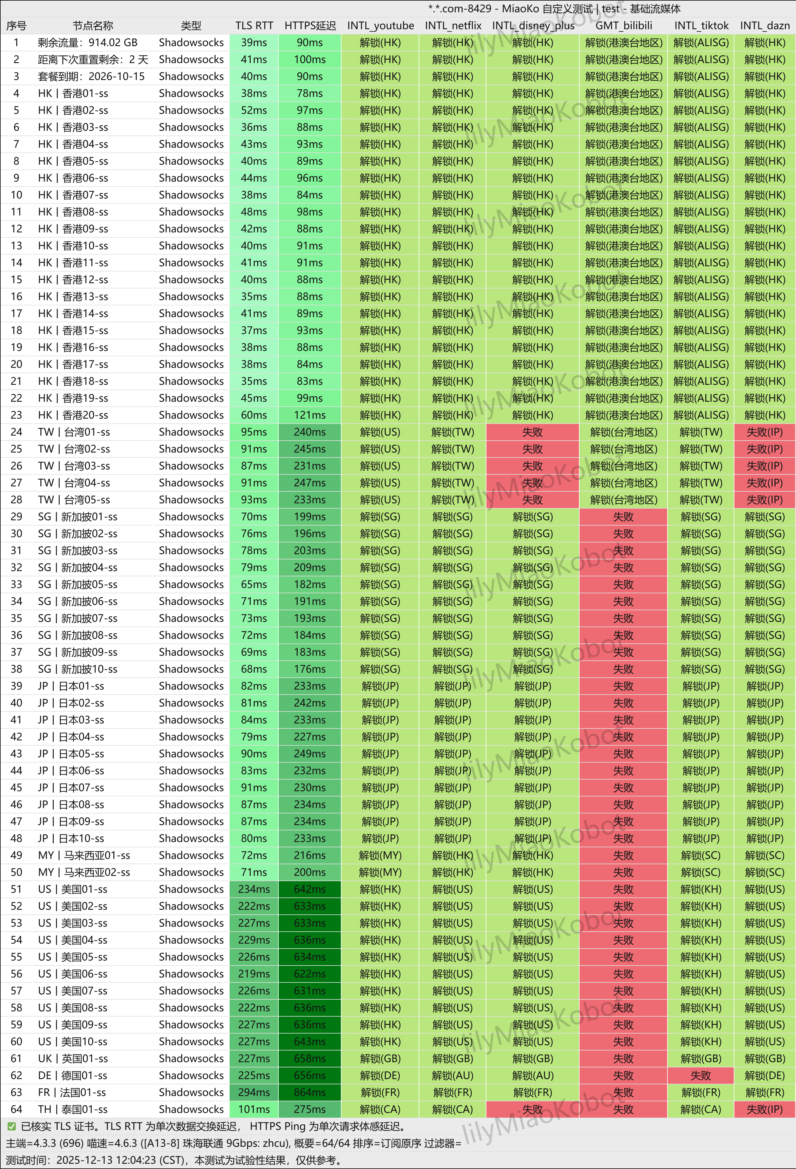本周我的流量不足了,测的不够全,测到的节点数据不错,解锁一如既往的好,每秒速度显示很稳。